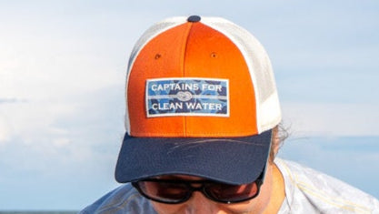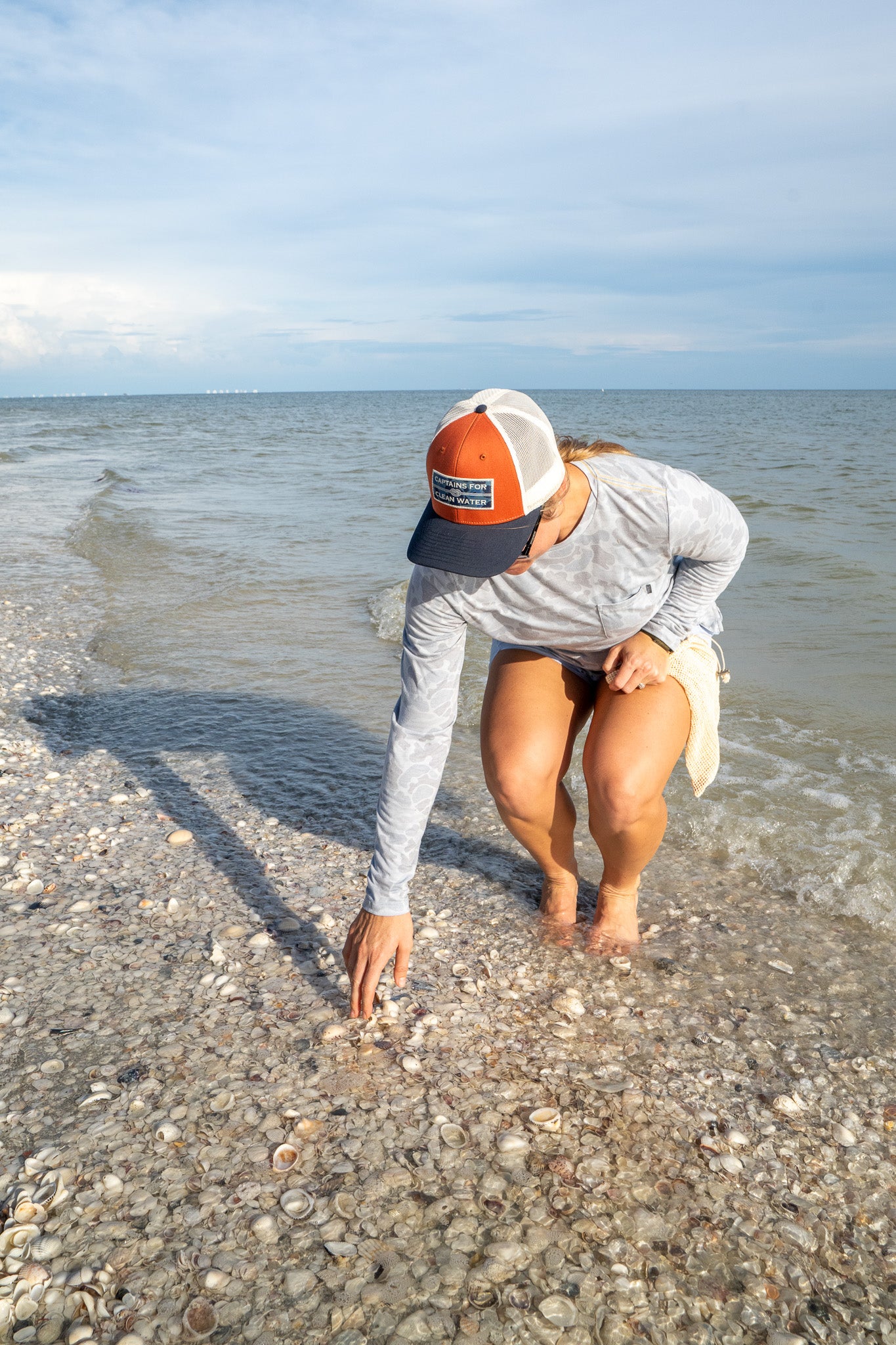 Bold like a Gulf sunset and built for life on the water. This Low Profile 115 Trucker combines burnt orange tones with a blue camo patch, inspired by the shallow waters where stealth and style both matter.