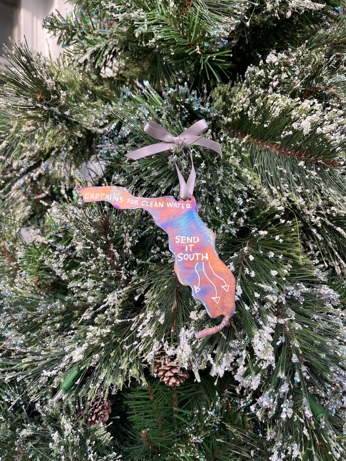 Stainless steel 'Send it South' ornament handmade by our friend Ashley Weber, an amazing artist, angler, and advocate from the Mosquito Lagoon area.